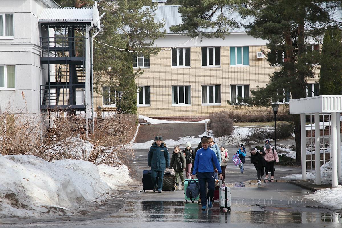 Прибытие учеников младших классов, эвакуированных из Белгорода, в лагерь отдыха "Лазурный".