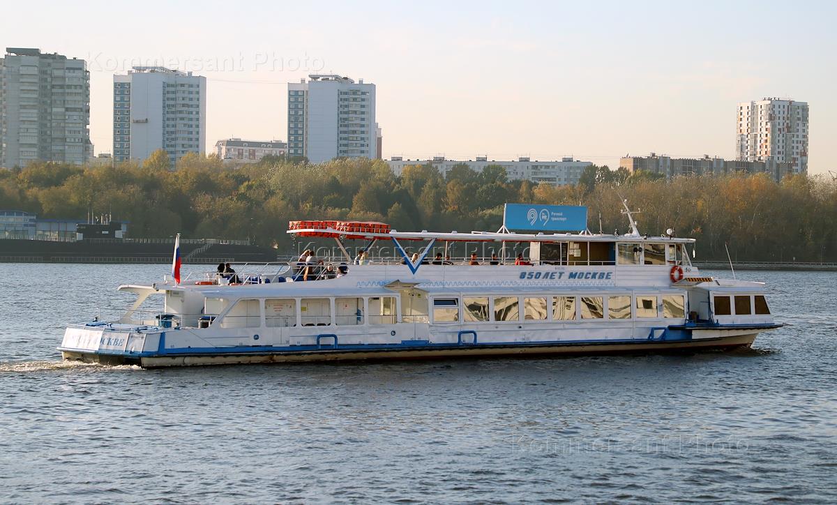 Жанровая фотография. Прогулочный корабль с надписью на борту "850 лет Москве" на Москва-реке.