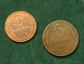 Жанровая фотография. Монеты достоинством 3 и 5 копеек выпуска 1924 года в Музее управления…