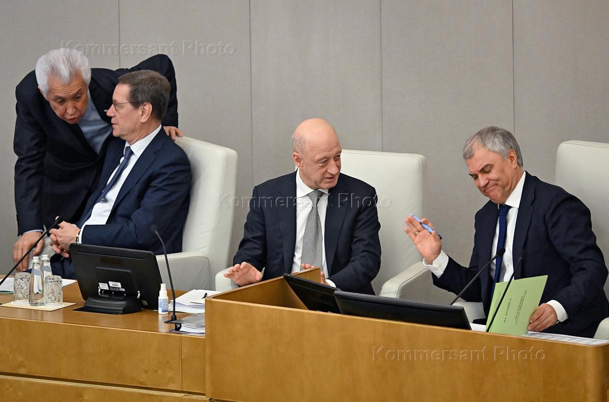 Пленарное заседание Государственной думы (ГД) России. Справа налево: заместители руководителя…