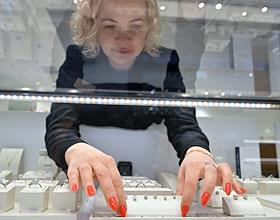 Работа ювелирного магазина SUNLIGH в TЦ "МЕГА Белая дача". Жанровая фотография. Продавец в торговом…