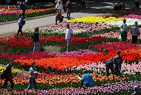 Выставка "Парад тюльпанов" в Никитском ботаническом саду. Посетители на выставке.