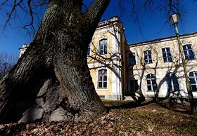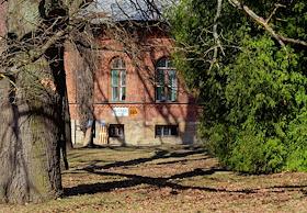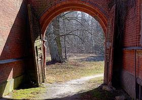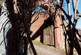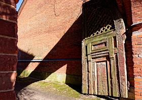 Views of the Znamenka estate. Brick building with old wooden gates.