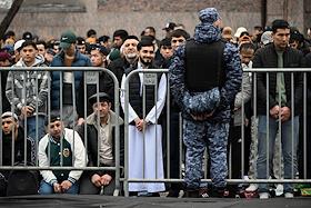 Праздничные мероприятия в день Ураза Байрам в Московской Соборной мечети. Сотрудник полиции перед…