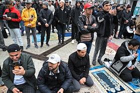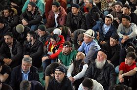 Праздничные мероприятия в день Ураза Байрам в Московской Соборной мечети. Верующие перед началом…