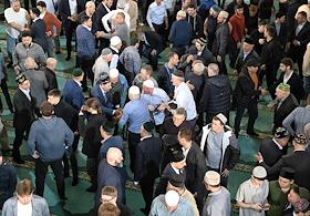 Праздничные мероприятия в день Ураза Байрам в Московской Соборной мечети. Верующие после окончания…