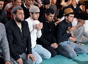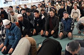 Праздничные мероприятия в день Ураза Байрам в Московской Соборной мечети. Верующие во время…