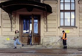 Виды Санкт-Петербурга. Жанровая фотография. Сотрудник ГУДП "Центр" во время промывки тротуара.