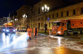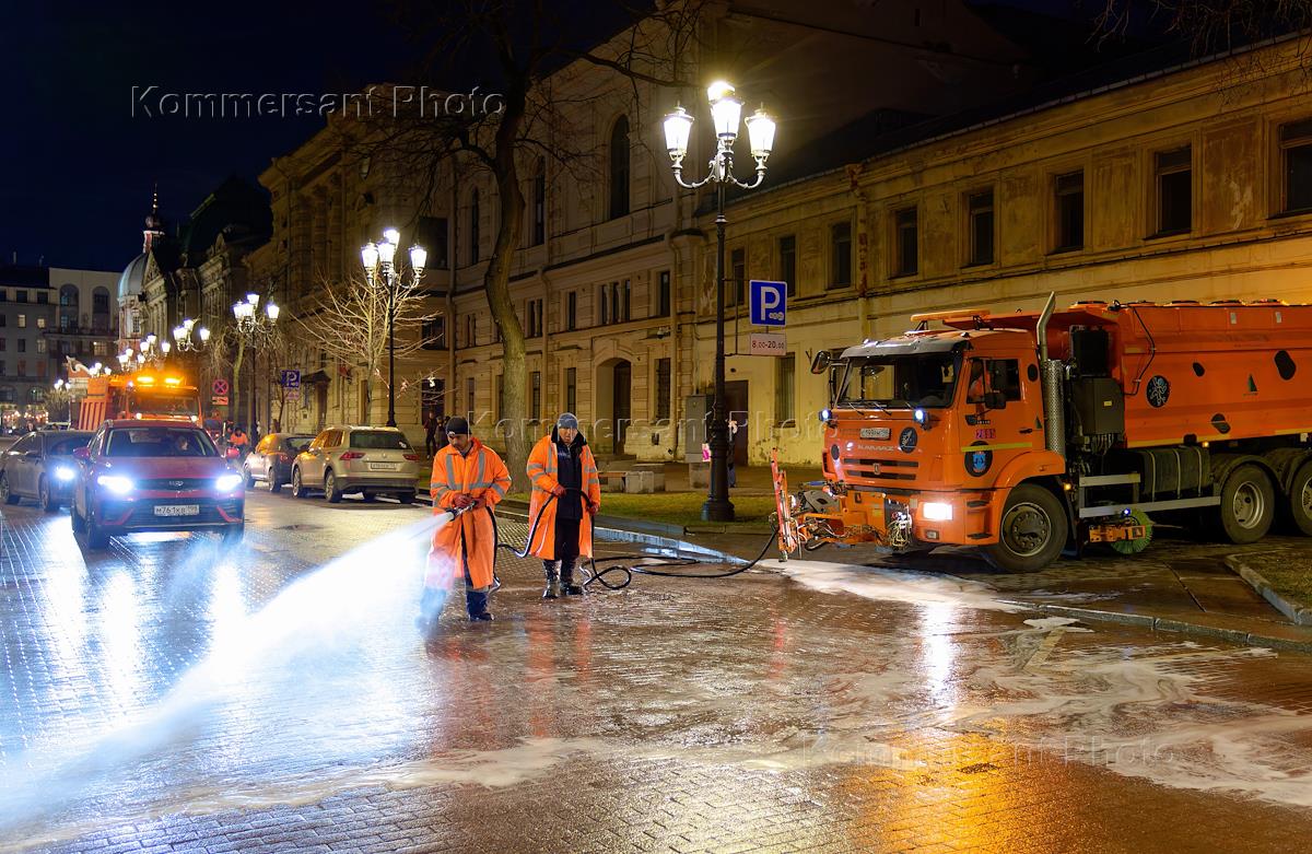 Виды Санкт-Петербурга. Жанровая фотография. Сотрудники ГУДП "Центр" во время промывки тротуара и…