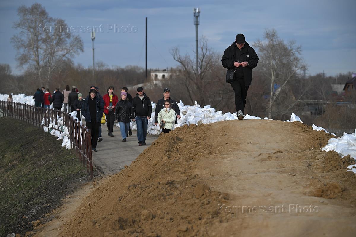 Паводок в Кургане. Работы по укреплению дамбы. Жанровая фотография. Мешки с песком в центре города…