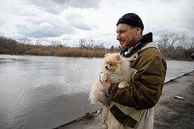 Паводок в Кургане. Жанровая фотография. Житель города с собакой на руках на берегу реки Тобол.