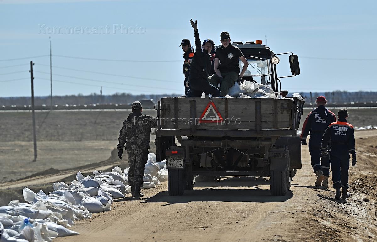 Паводок в Тюменской области. Военнослужащие во время работ по сооружению противопаводковой дамбы на…