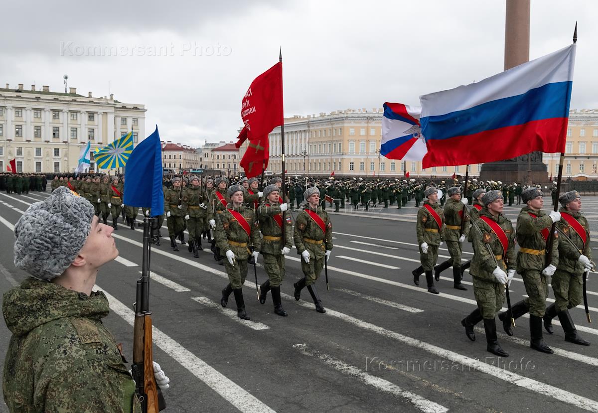 Первая сводная репетиция парада, посвященного 79-ой годовщине Победы в Великой Отечественной войне, на Дворцовой площади.