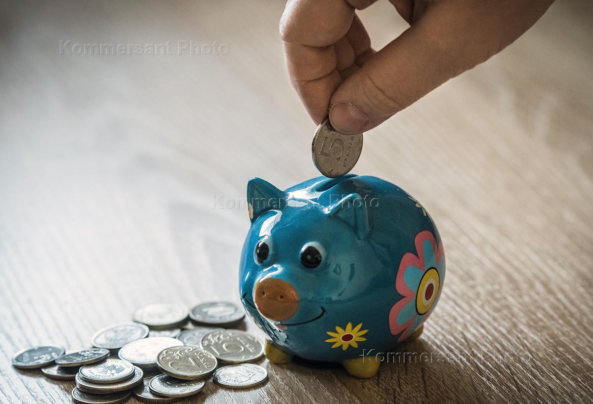 Жанровая фотография. Копилка в виде свиньи и рублёвые монеты на столе.