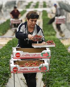 Сбор урожая клубники в тепличном хозяйстве "Сладкая клубника" в селе Холмовка Бахчисарайского района. Хозяйство продает крымские ягоды и прямо с поля отправляет в Москву, Санкт-Петербург, Новосибирск и Красноярск.