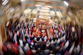 Религия Праздничное пасхальное богослужение в Вознесенском кафедральном соборе в Новосибирске. Жанровые фотографии. Верующие во время пасхальной службы в Вознесенском кафедральном соборе.