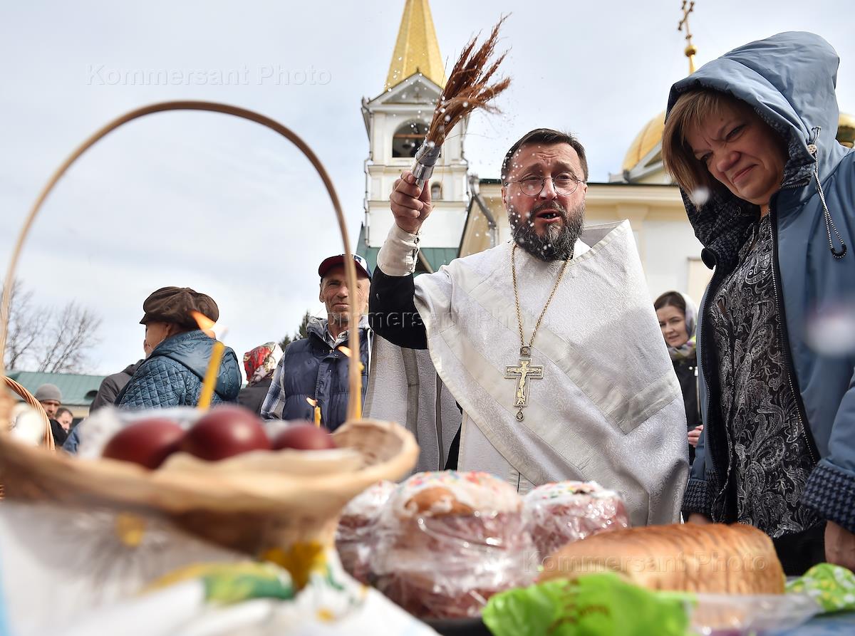 Освящение пасхальных куличей и яиц у Вознесенского кафедрального собора в Новосибирске.