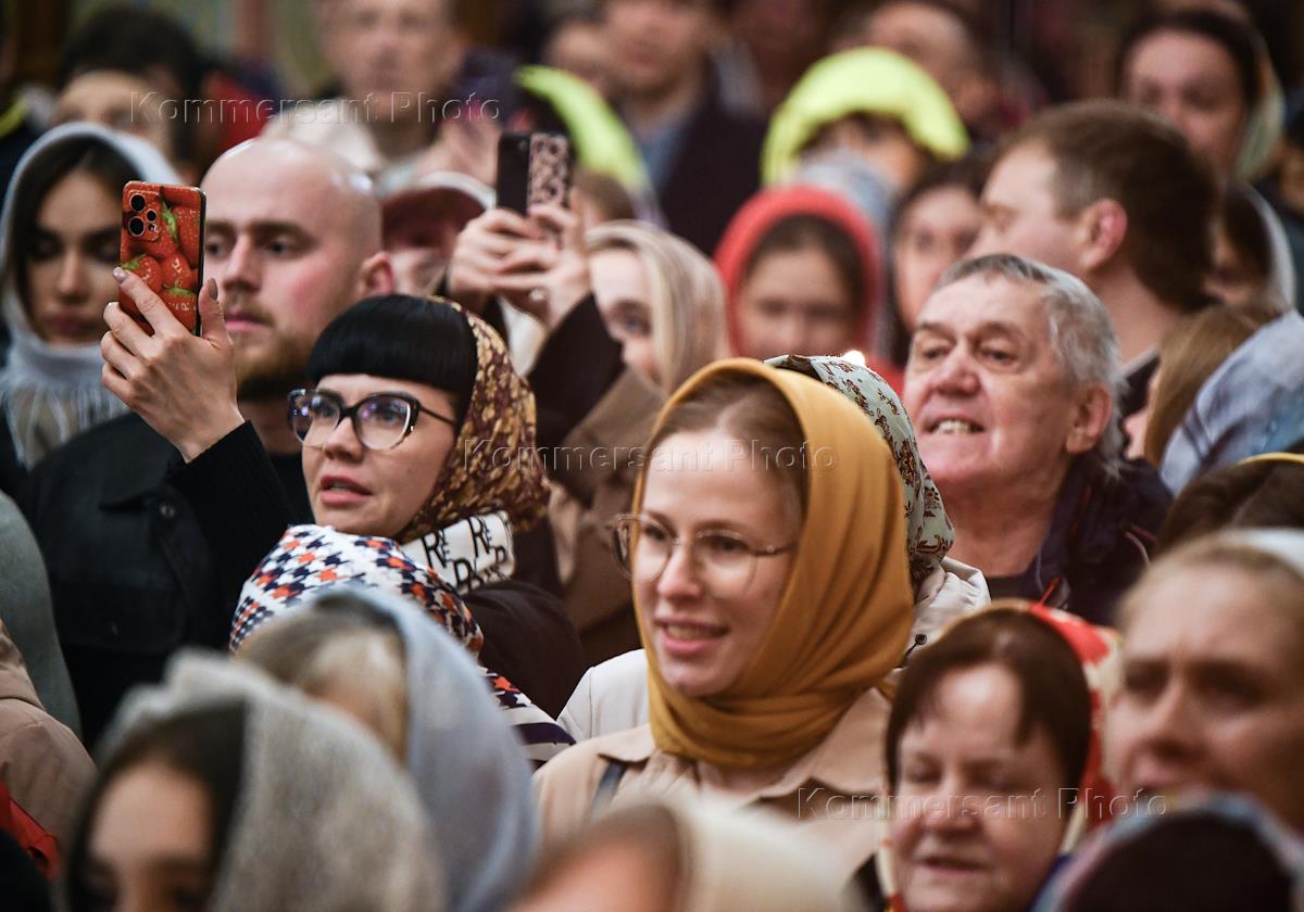 Праздничное Пасхальное богослужение в храме Святого Иоанна Предтечи. Верующие во время пасхальной…