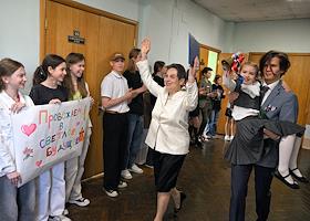 Праздник "Последний звонок" для выпускников в "Школе № 1251 имени генерала Шарля де Голля". Учитель…