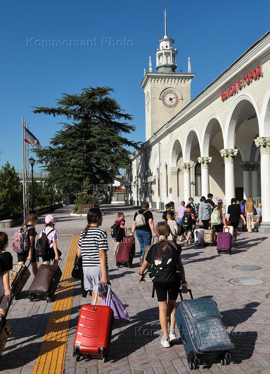 Прибытие школьников из Белгородской области на железнодорожный вокзал Симферополя для оздоровления и отдыха в Крыму.