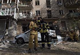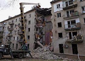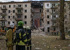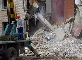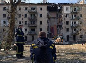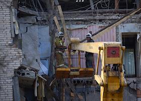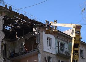 Последствия обстрела Луганска. В одном из многоэтажных домов полностью обрушился подъезд. Сотрудники…