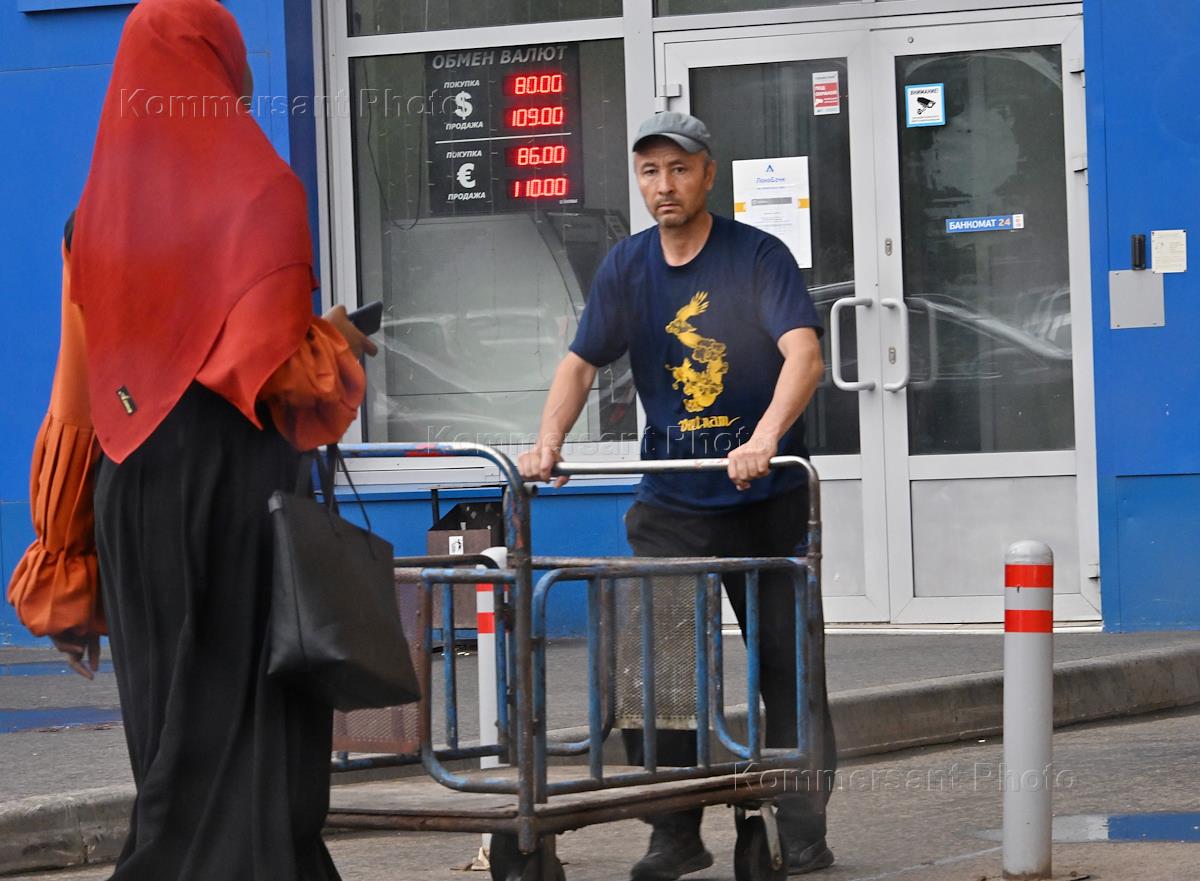 Жанровая фотография. Семья у входа в пункт обмена валюты.