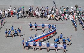 Празднования Дня России в Волжском. Участники празднования в национальных костюмах во время…