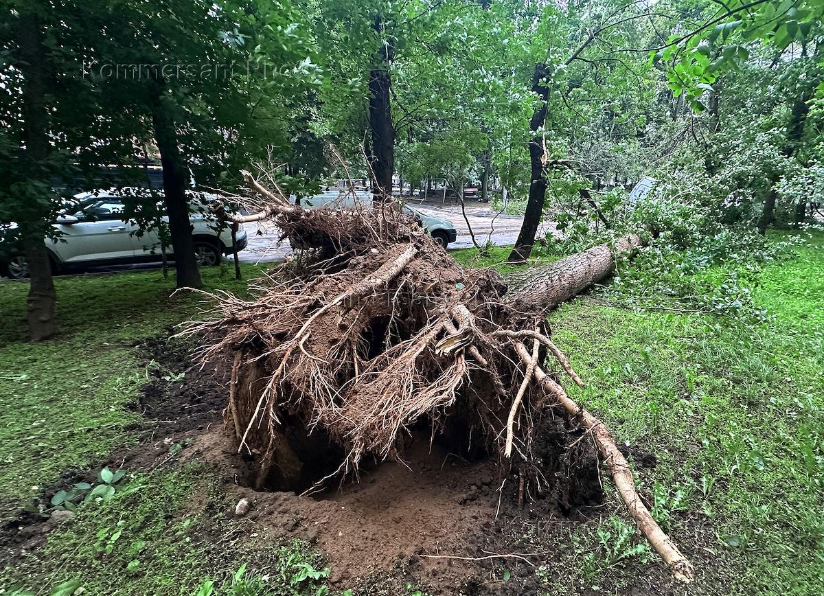Жанровая фотография. Сильный ветер и ливень в городе. Последствия урагана. Упавшее дерево на…