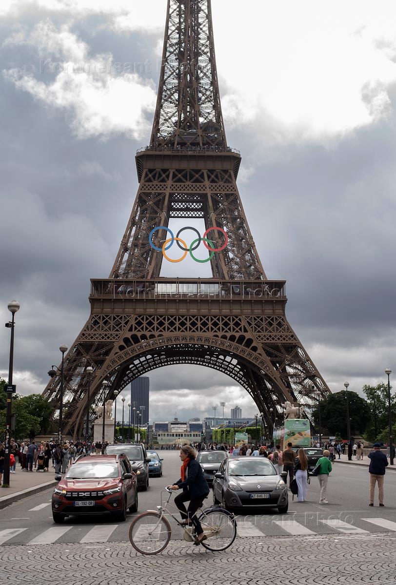 Жанровая фотография. Эйфелева башня с символом летних Олимпийских игр 2024 - Олимпийскими кольцами.