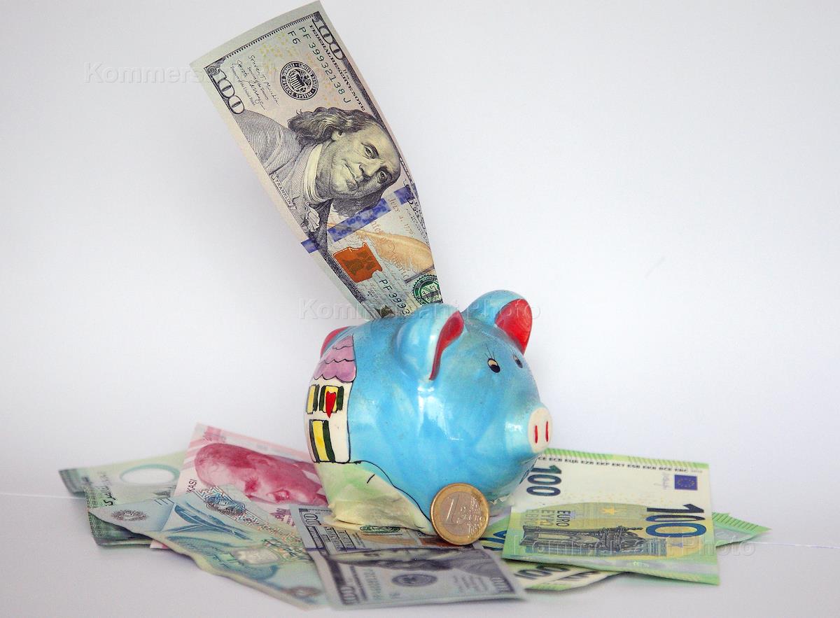 Жанровая фотография. Денежные банкноты и копилка в виде свиньи.