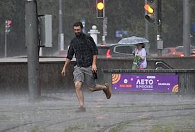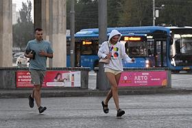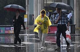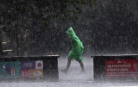 Жанровая фотография. Погода в городе. Люди на улице во время сильного дождя.