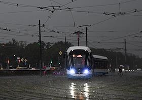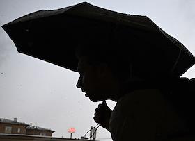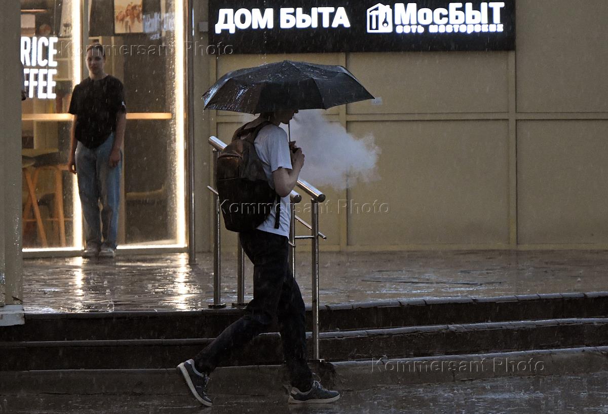 Жанровая фотография. Погода в городе. Силуэт человека под зонтом на улице во время сильного дождя.