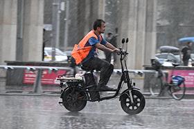 Жанровая фотография. Погода в городе. Мужчина на велосипеде на улице во время сильного дождя.