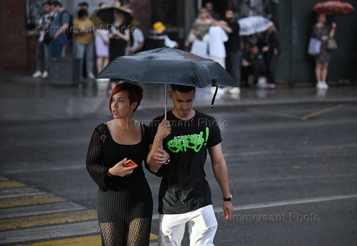 Жанровая фотография. Погода в городе. Люди на улице во время сильного дождя.