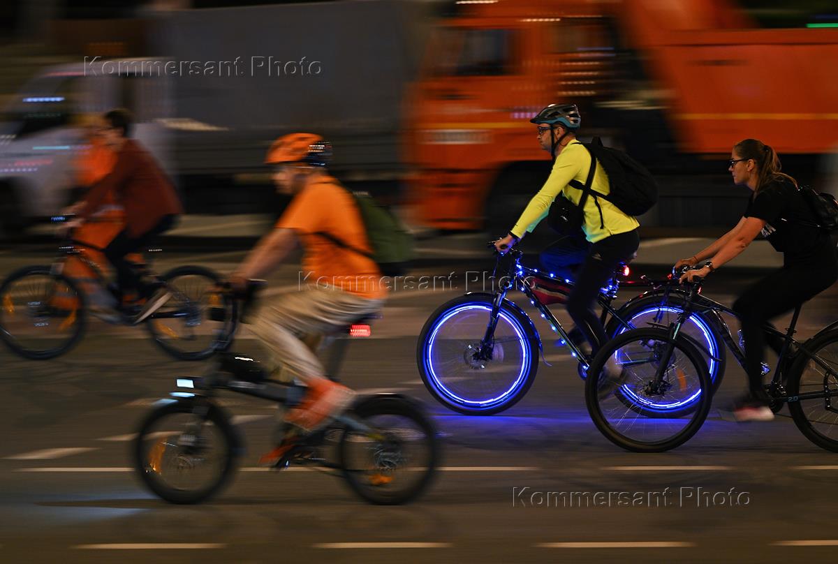 Московский ночной велофестиваль 2024. Участники во время велозаезда по улицам города. Жанровая…