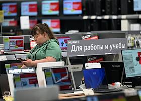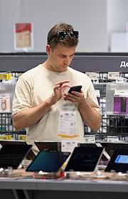 Работа магазина "М.Видео" в торговом центре (ТЦ) "Метрополис". Жанровая фотография. Покупатель в…