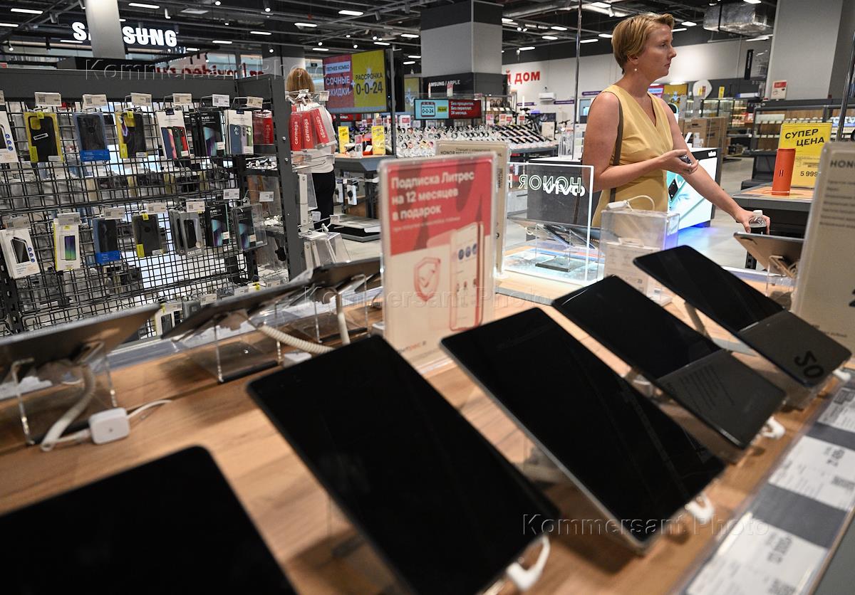 Работа магазина "М.Видео" в торговом центре (ТЦ) "Метрополис". Жанровая фотография. Покупатели в…