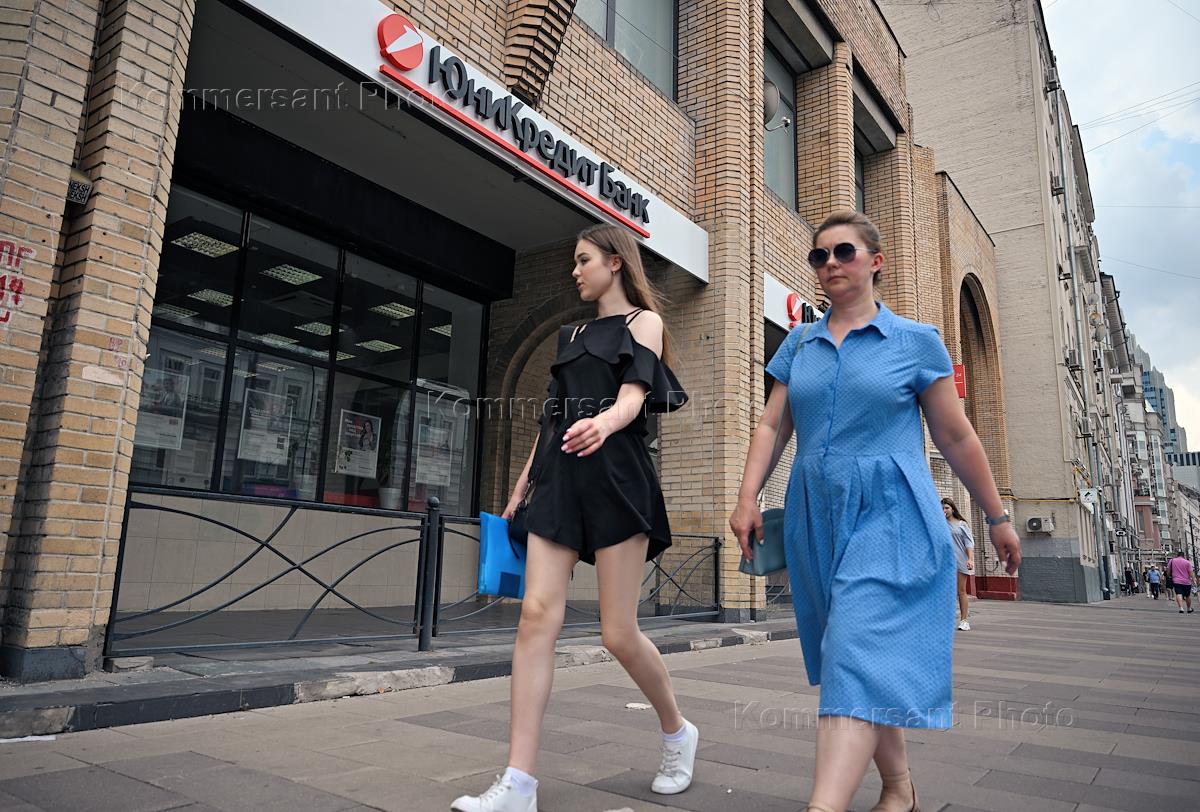 Жанровая фотография. Вывеска "ЮниКредит" над входом в отделение банка и рекламные стикеры банка ВТБ…