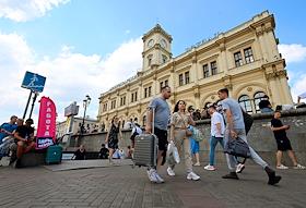 Виды Москвы. Жанровая фотография. Площадь трех вокзалов (Комсомольская площадь). Пассажиры у входа в…