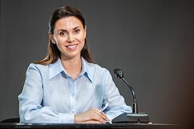 Молдавская журналистка Наталья Морарь во время брифинга, на котором она объявила о своем намерении баллотироваться на пост президента Молдовы как независимый кандидат.