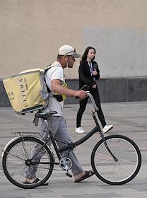 Жанровая фотография. Виды Москвы. Курьер сервиса доставки "Купер" (Сбермаркет) на велосипеде на…