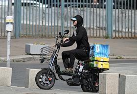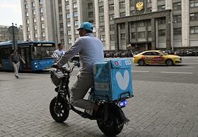 Жанровая фотография. Виды Москвы. Курьер сервиса доставки "Вкус вилл" едет на мопеде по улице.