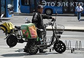 Жанровая фотография. Виды Москвы. Курьер сервиса доставки "Пицца. Суши. Вок" стоит на мопеде у…