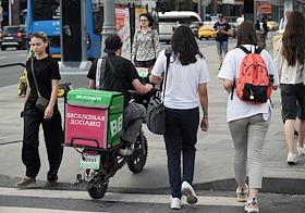 Жанровая фотография. Курьеры сервиса доставки "Купер" (Сбермаркет), "Яндекс", "Самокат". Электоросамокаты.