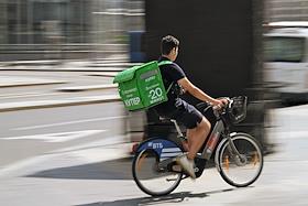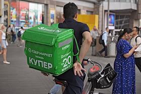 Жанровая фотография. Курьер сервисов доставки еды "Купер" (Сбермаркет) и "Яндекс" едет на велосипеде.