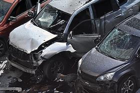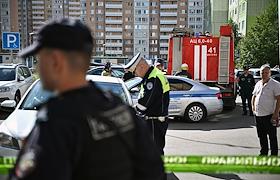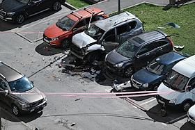 Последствия взрыва автомобиля Toyota Land Cruiser на Синявинской улице в Москве.