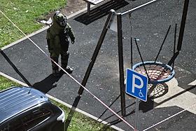 Последствия взрыва автомобиля Toyota Land Cruiser на парковке возле жилого дома на Синявинской улице.
