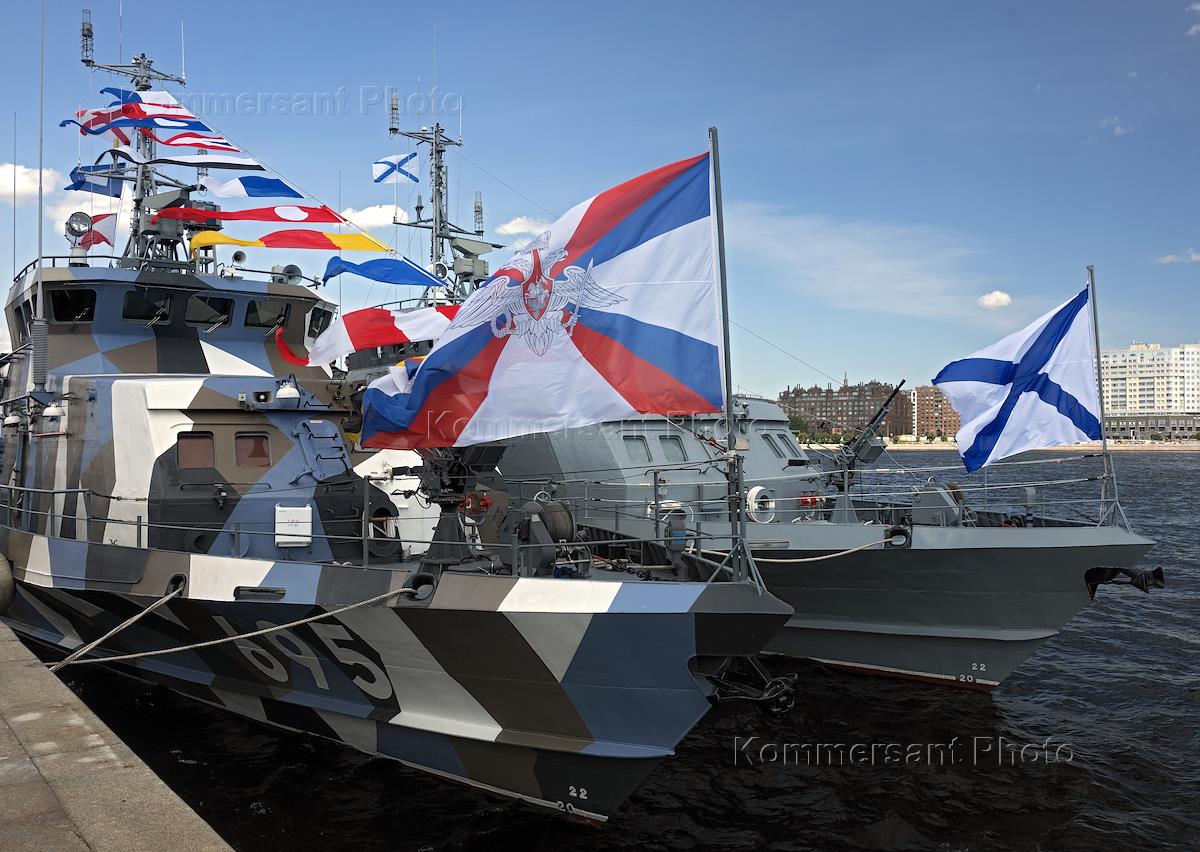 Rehearsal of the Main Naval Parade in honor of Russian Navy Day in the waters of the Neva River.…