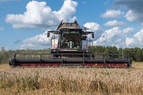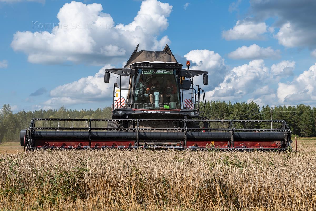 Сбор урожая в Лаишевском районе. Зерноуборочный комбайн "Ростсельмаш" во время работы.