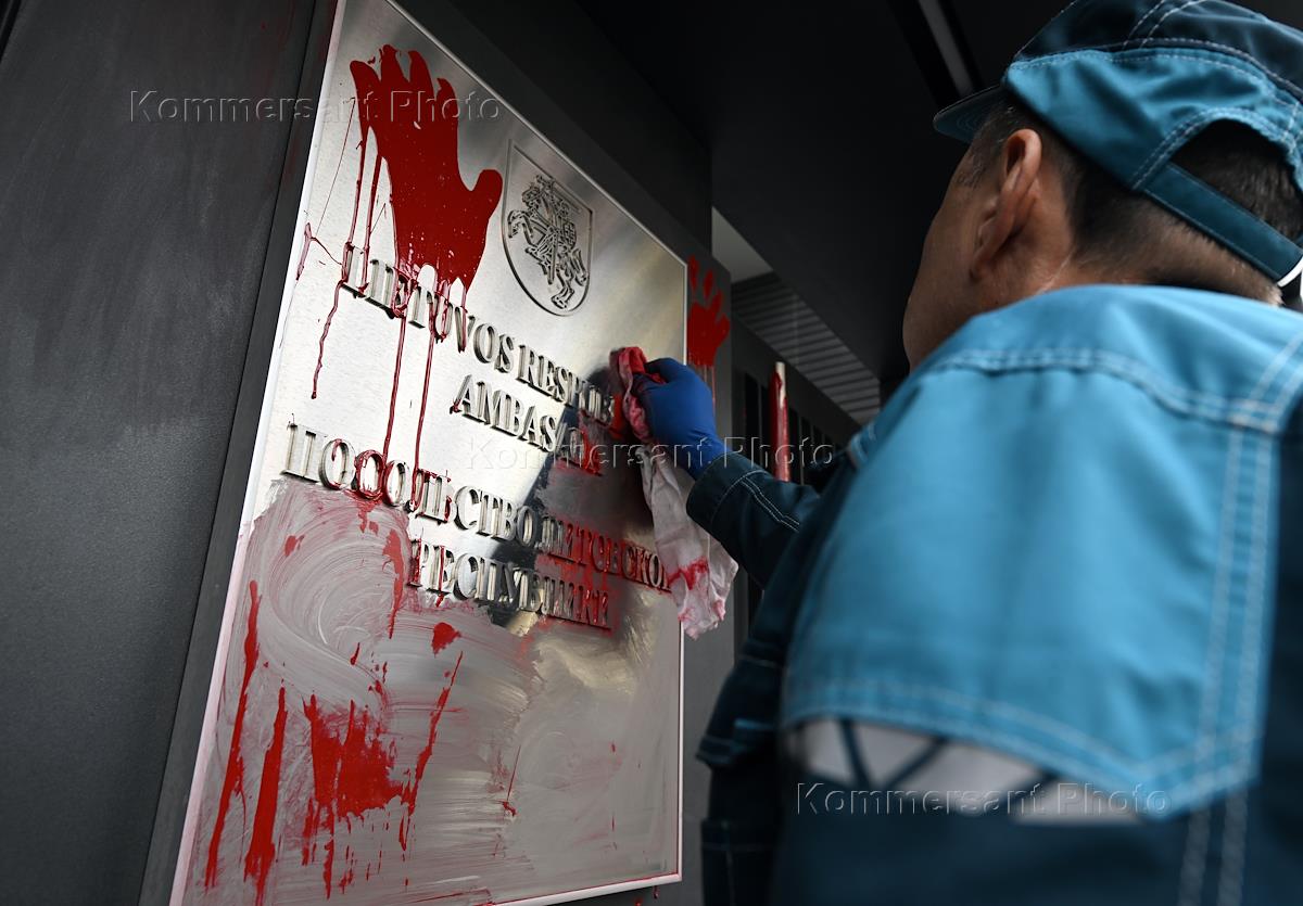 Табличка на здании Посольства Литвы в Москве, облитая красной краской. Жанровая фотография. Мужчина…